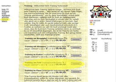 Gut, wie man eine Arbeit findet ist Euch nun klar, kommen wir zu einem Thema, das Euch körperlich wirklich fordert und Eure Eigenschaften verbessert: Das Training. Je nach Fähigkeit könnt Ihr ein spezielles Training wählen um Euch aufzuwerten. Das Training dauert regulär drei Stunden, Ihr könnt dabei bis zu 19 Gesundheitspunkte verlieren, doch es wird sich lohnen, je härter Ihr trainiert desto stärker werdet Ihr Eurem Gegner im Kampf gegenüberstehen!