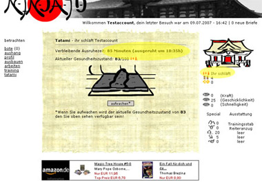 Ihr legt Euch nun schlafen, aktuell habt Ihr 83 von 100 Gesundheitspunkten, Ihr entscheidet Euch für den kostenlosen Tatami, da Ihr anfangs noch wenig Goldbarren besitzt. Um 18:35h werdet Ihr komplett genesen sein, früh genug um für 19h einen Kampf zu buchen, den Ihr auch einhalten könnt. Seid vorsicht, wenn Ihr zu lange schläft, trainiert oder übermütig arbeitet könnte es passieren, dass Ihr einen fix gebuchten Kampf um 19h verpasst. Falls es passiert erlangt Euer Gegner ohne etwas zu tun Ehrenpunkte und Goldbarren und Ihr seid ehrenlos fern geblieben!
