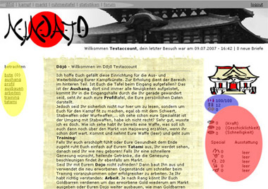 Willkommen im Dojo! Nachdem Ihr Eure Waffengattung gewählt und Euch für eine Spezialfähigkeit entschieden habt, darf ich Euch nun in Eurem Heim begrüssen. Der blaue Kreis zeigt Euren Gesundheitszustand an, die Anzahl an Goldbarren, die Ihr Euer eigen nennen könnt und Eure Ehrenpunkte. Ganz oben, grau gefärbt, seht Ihr Euer Hauptmenü, das gelb umrandetet Feld repräsentiert das Untermenü dazu. Nachdem Ihr Euch durch die Menüs geklickt habt werdet Ihr schon ein Gefühl für die Navigation bekommen.